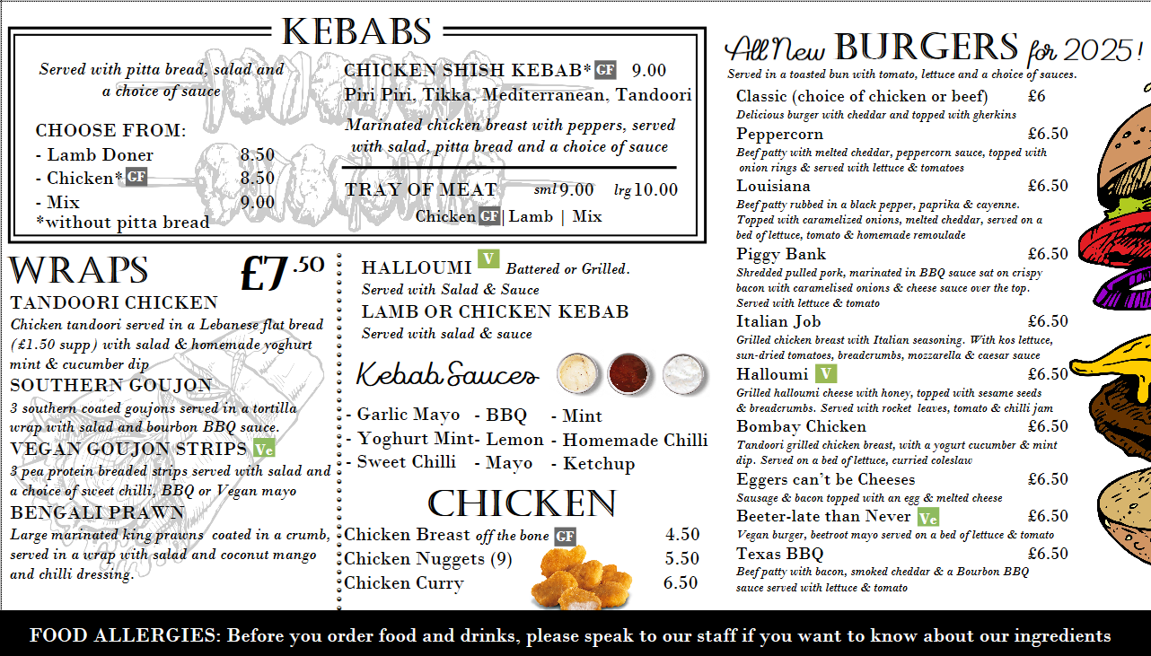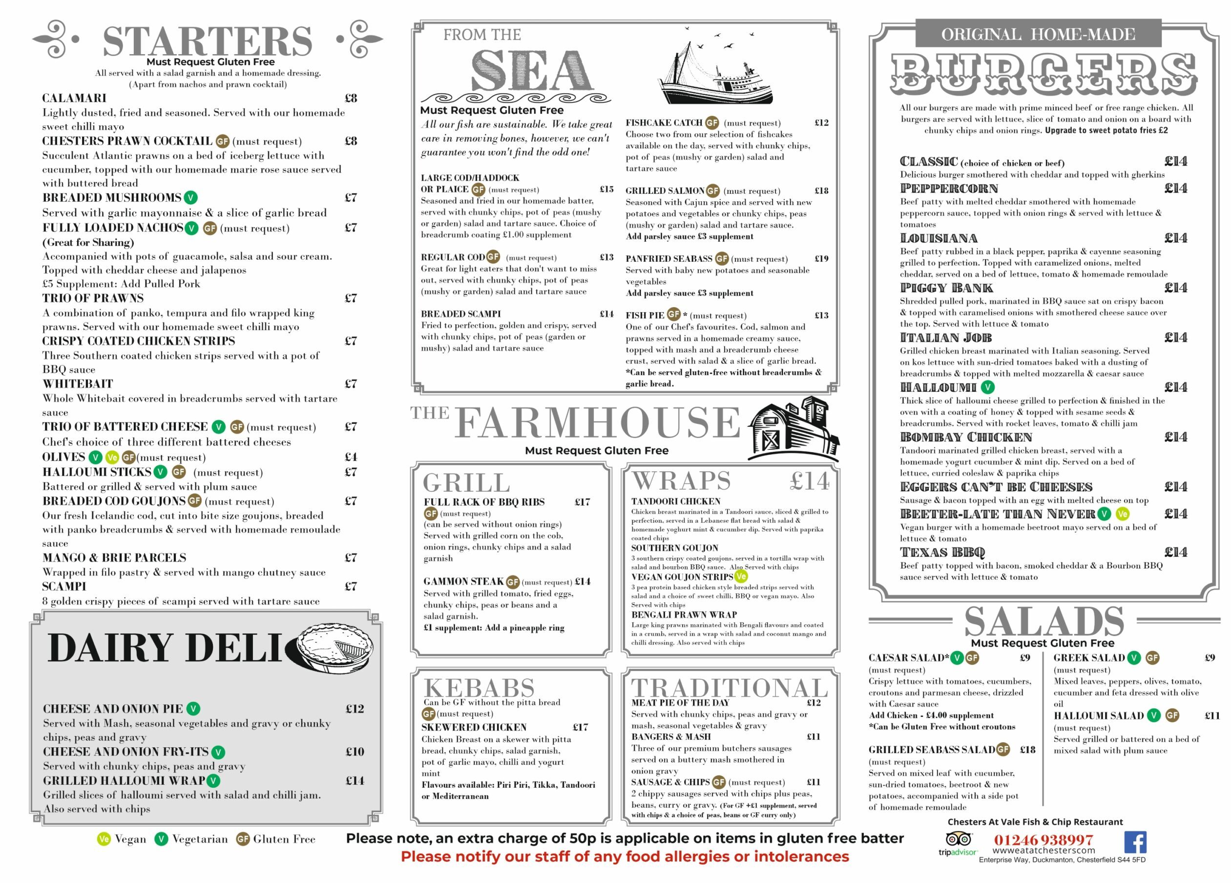 Chesters has ample car park situated on the front court and also to the side of the premises with a further overflow car park at the rear of the restaurant. We are fully licensed with a wide selection of wines and beers to choose from. Your meals or drinks can be enjoyed in our relaxed air conditioned restaurant or on our rear decked garden. Our kitchen is fitted with the state of the art equipment and fryers with new technology oil draining system ensuring your food is cooked in clean vegetable oil every day! We also cater for celiacs and gluten free. Our meats are all British sourced and all our menu is cooked and prepared from fresh ingredients. Our kebabs are available in a variety of flavours; Piri Piri, Tikka and Mediterranean. Our delicious new pies are made by our private baker and are available in many flavours. So come and try one of our mouth watering dishes which has given us our highly recommended reputation.