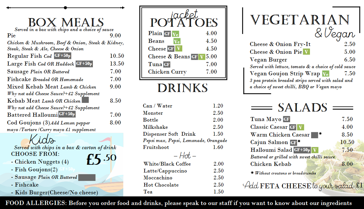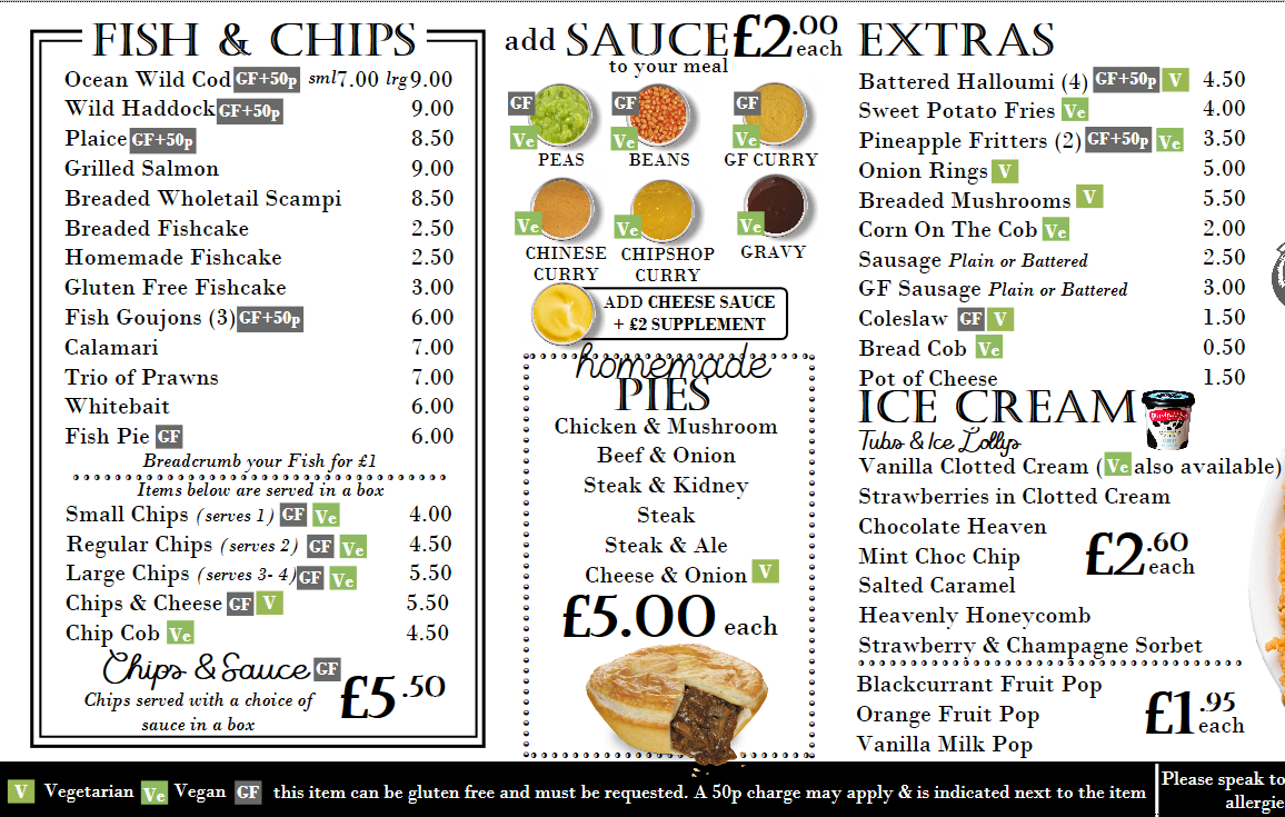In the 1980s, my parents had a very successful fish and chip shop in Derby which was known as one of the best, winning awards and having a reputable name. I learnt from the best! Growing up in the trade after school I use to sit on the huge pile of spuds and watch staff peel the Maris Pipers. Then the fresh fish delivery would come and I would help them unpack it never forgetting that fresh sea salt scent. We would then prepare the fish for my father, who would use his homemade batter recipe to fry up the best fish and chips in town. Finally my mother and sisters would serve it up with a smile! You see it’s not just selling fish and chips for us it’s our life and all we have ever known. Unlike some other establishments this is not a franchise or just another setting up of a business this is our life and what we do best! You can’t ask a musician to paint you a portrait! All those days I rushed home from school eager to help and learn has all paid off as me and my wife do what we love best and serve customers we love the food we love! We are run with family pride!