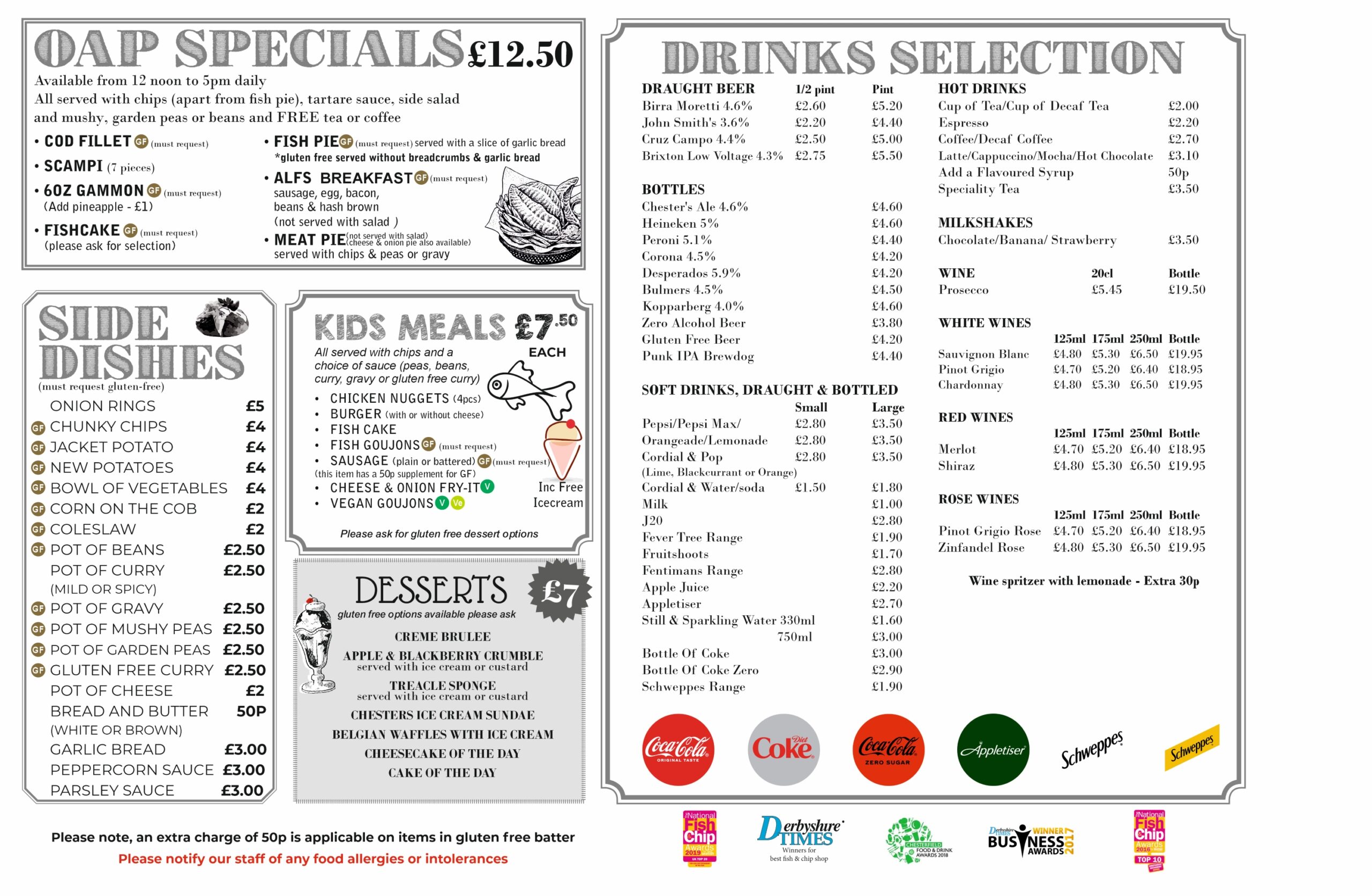 Here at Chesters we know our fish and chips! We have built our reputation from using the best fresh fish and finest potatoes. We have a wide range of fresh fish available from the popular Cod and Haddock to plaice, sea bass and salmon. Our specials board has fish caught and bought from trawlers at Grimsby, such as lemon sole, halibut, sea bream, hake, crab and fresh lobster! Whether you choose to have your fish cooked in our homemade batter or grilled you can be sure that it will be cooked to order and to perfection.